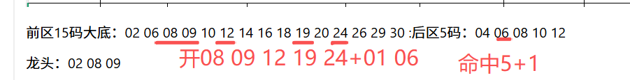 首先回顾大乐透上期开奖结果:08 09 12 19 24+01 06。上期大底命中5+1等。