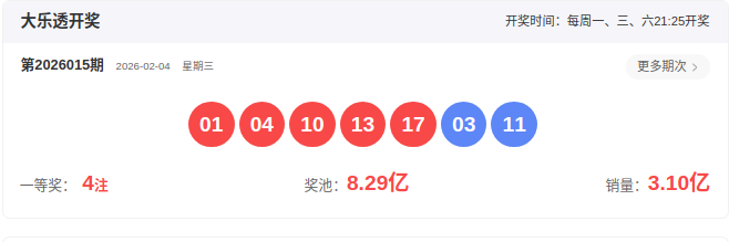 开奖号码:01 04 10 13 17- 03 11