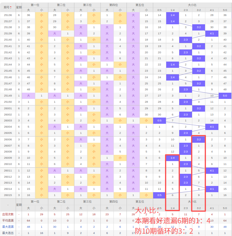 上期大小比:0:5,近10期大小比出现情况:3:2、2:3、2:3、1:4、2:3、4:1、2:3、2:3、4:1、0:5,最近10期出现1期3:2,出现5期2:3,出现2期4:1,出现1期1:4,出现0期5:0,出现1期0:5,根据近10期规律本期看好遗漏6期开1:4,防10期循环的3:2,综上所述推荐大小比推荐:3:2,重点关注:1:4。