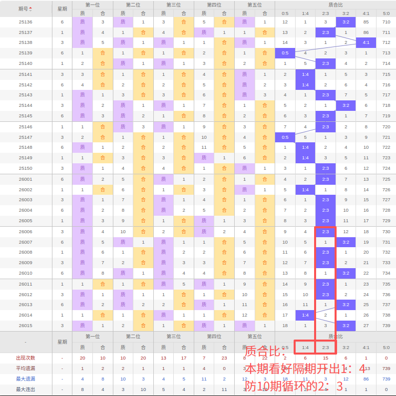 上期质合比:3:2,近10期质合比出现情况:2:3、3:2、2:3、2:3、3:2、2:3、2:3、3:2、1:4、3:2,最近10期出现4期3:2,出现5期2:3,出现0期4:1,出现1期1:4,出现0期5:0,出现0期0:5,根据近10期规律本期看好隔期的1:4,防10期循环的2:3,综上所述推荐质合比推荐:2:3,重点关注:1:4。