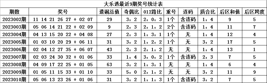 后区跨度:后区近9期跨度分别开出5-7-4-5-1-5-4-9-5,跨度奇偶比为7:2,上期跨度下降4个点位,本期防跨度再次下降,注意奇数跨度出现,关注跨度3。