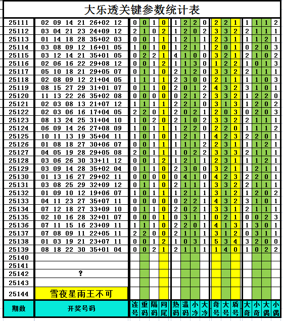 上期热、温、小、大冷2111组合形态。追踪数据请参考前面的大乐透关键参数统计表。
