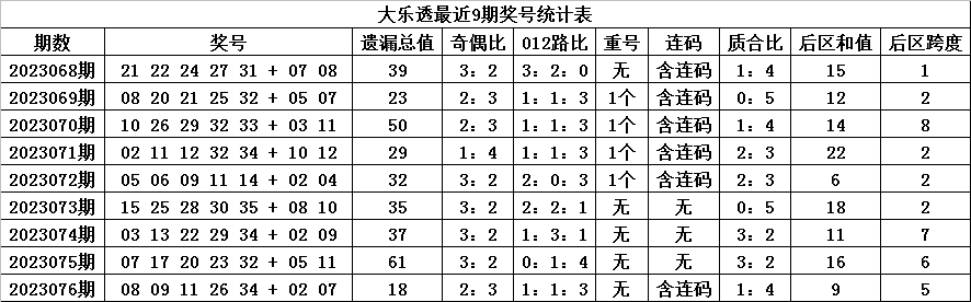 体彩大乐透第2023076期奖号为:08 09 11 26 34 + 02 07,各位号码遗漏期数分别为:6期、3期、3期、5期、1期+1期、6期,前区号码遗漏总期数为18期,012路比为1:1:3,奇偶比为2:3,没有开出重复号码。后区号码遗漏总期数为7期,和值为9,跨度为5。