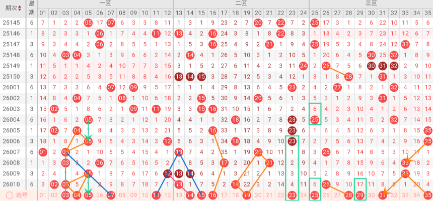 三区(25-35)分析:上期该区开出号码29 33,近10期占比22%,与上期相比无变化。本期无三斜连号趋势,隔码斜连走势:32。