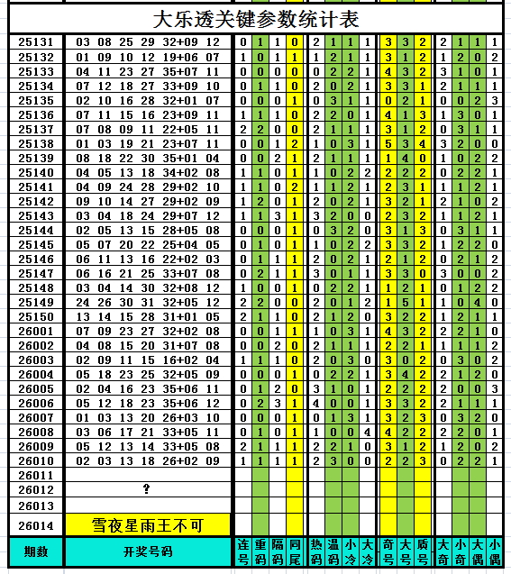 以下是作者手工统计的大乐透关键参数统计表,对喜欢参数分析、过滤缩水、选号胆杀的技术性大乐透爱好者有所帮助,其它读者可略过不看。