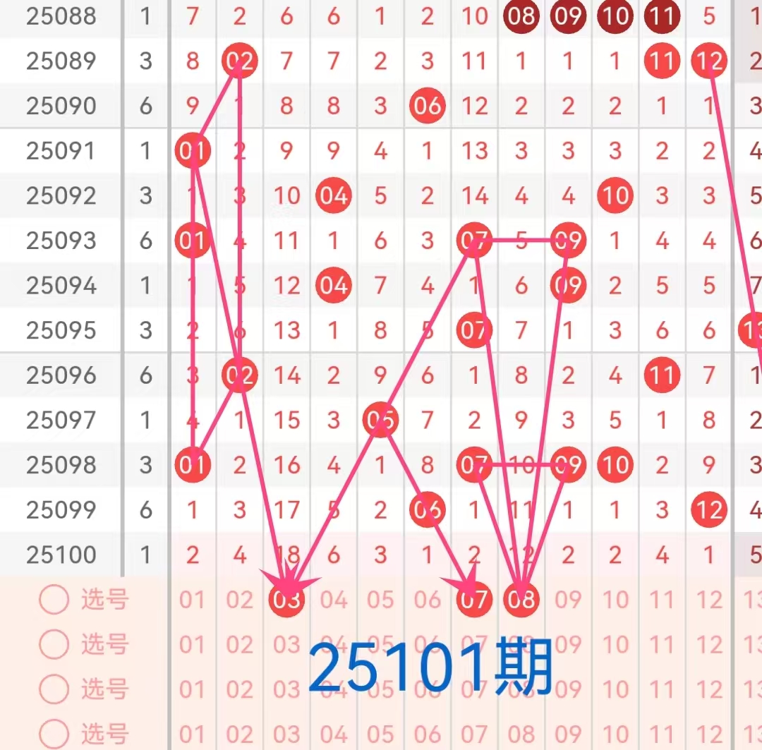 1. 一区(01-12):上期该区间没有任何号码开出,形成短暂的断区现象。由于近期该区间较少,本期考虑仍然会有1-2个号码回补开出,建议关注该区间内的其他号码03、07和08。号码03和08这俩号码遗漏次数较大,号码07近期表现较好。这些号码在历史数据中出现频次较高,且有一定的遗漏期数,可能会在本期出现。
