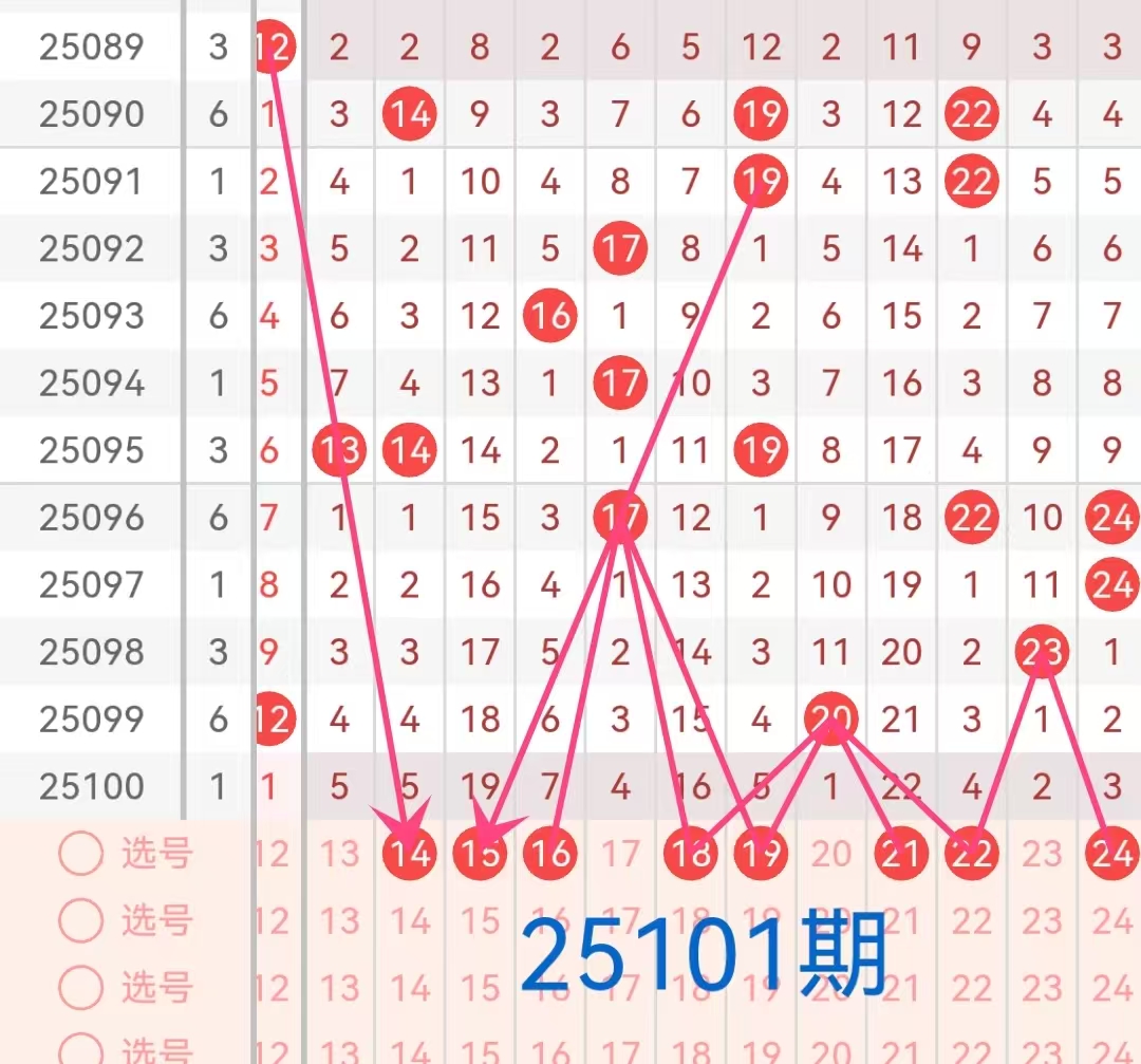 2. 二区(13-24):上期该区间同样也是没有任何号码开出,形成短暂的断区现象。预计本期会有1-3个号码回补开出。本期可以关注该区间内近期遗漏次数较大的号码,如15、18、21些号码在走势上表现出一定的稳定性,且与前几期出号形成呼应,有望出现在本期开奖中。号码14、16、19、22、24在画线走势上,有较好的出号走向,本期有望出现。