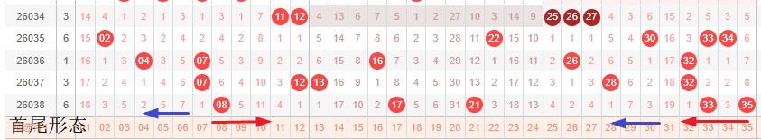 如图所示:首尾制约平衡组范围依次为:推拉缩,缩推? 本期形态范围优先选择红色压缩首尾均定首尾。由于上期号码处在3连带2连的分割完成,本期宜采取继续左推走势形成形态,或体现间隔1重号走势。
