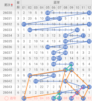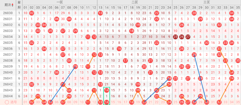 二区(13-24)分析:上期该区开出号码22,近10期占比32%,与上期相比+2%。本期无三斜连号趋势,隔码斜连走势20。