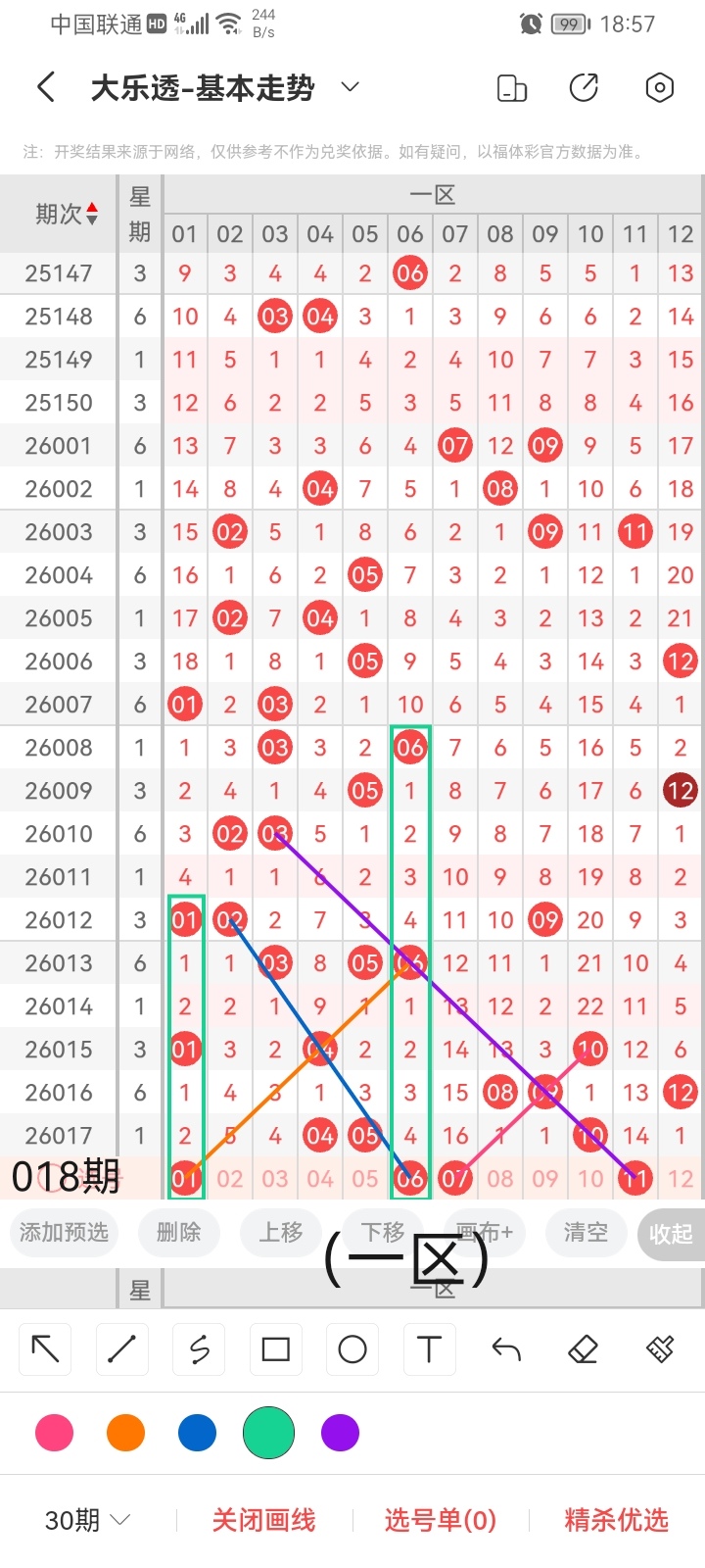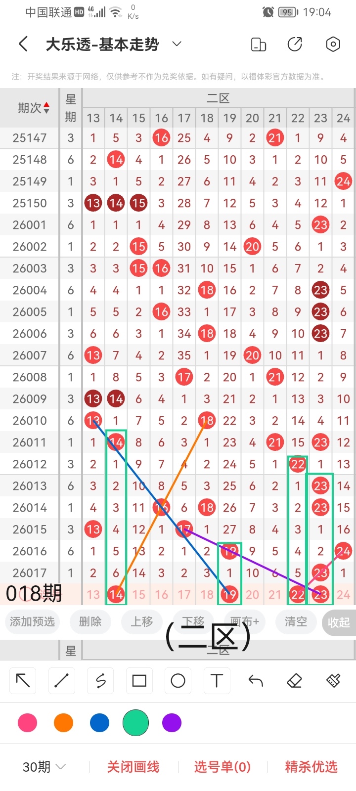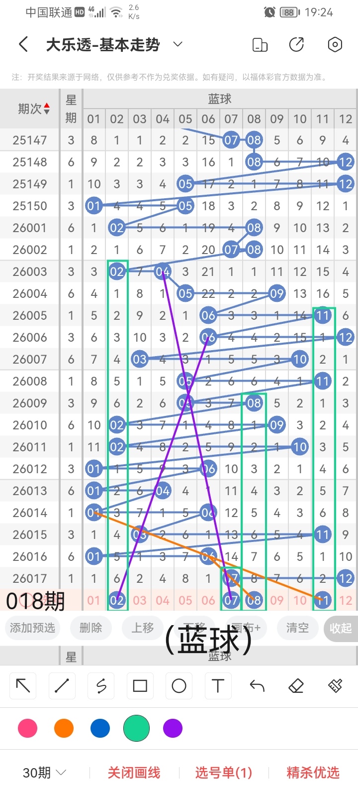 通过以上对上期的简单回顾,下面进入大乐透第2026018期(下面简称本期)的选号分析: