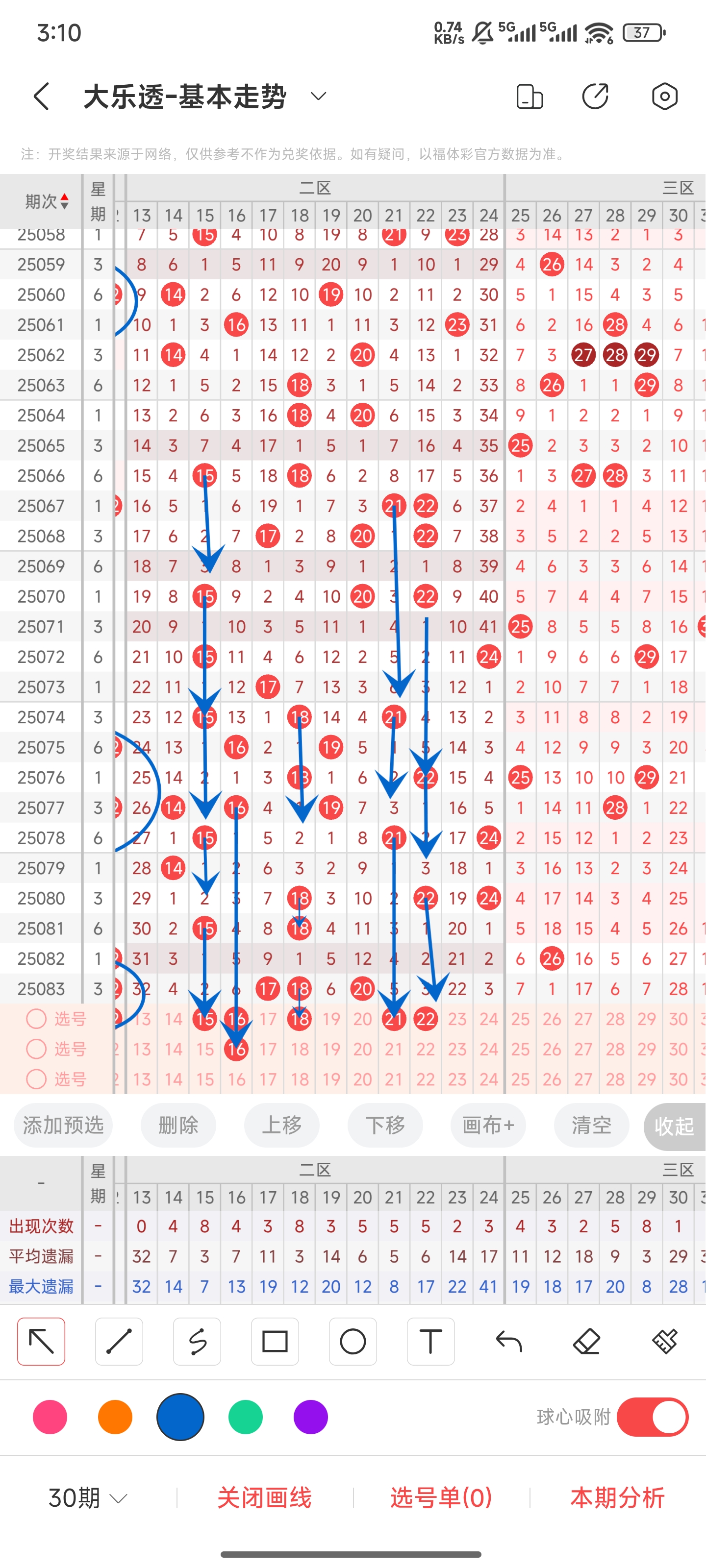 上一期三区开出了34,往一期开出26。通过走势图我们可以看到三区基本上开出的数字比较少,所以基本值开出比较热门的号码。所以本期我们也就关注比较热门的号码。遗漏的比较久热门的号码有28,29,33。而34上期开出了,本期依旧可以考虑一下可能会连出。35虽然是冷号,但结合遗漏期数,也可能会开出。所以本期三区我们推测可能开出28,29,33,34,35等号码。