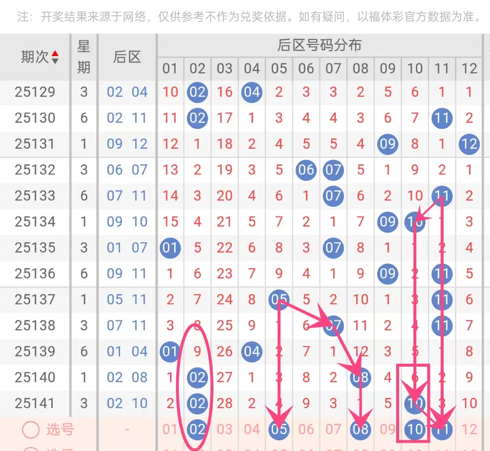 小号区稳定:01、02、04、05、07、08等号码频繁出现,其中02在近3期内出现2次,呈现热态;05、08也多次搭配前区中小号出现。