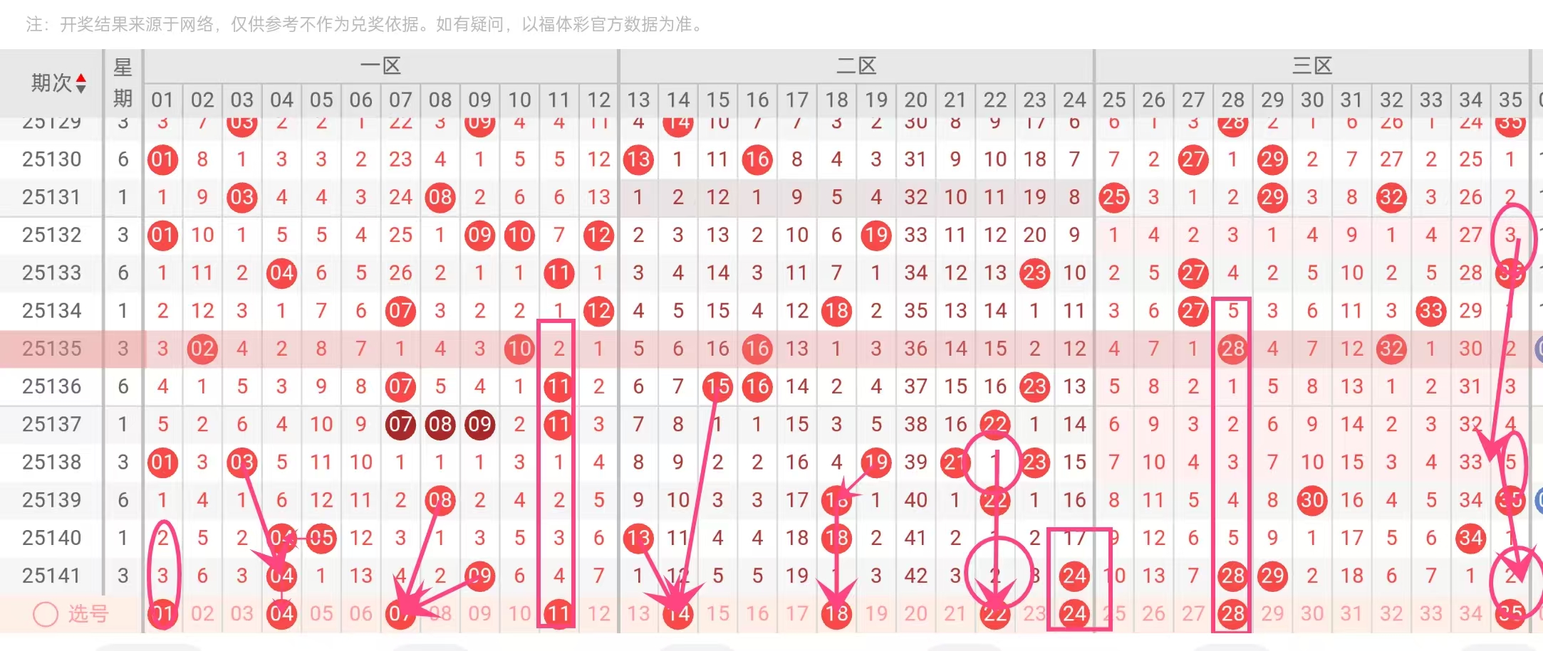 大号区间有回调空间:35在近5期内出现2次,且常与30+号码形成搭配,本期仍可关注其作为区间锚点。