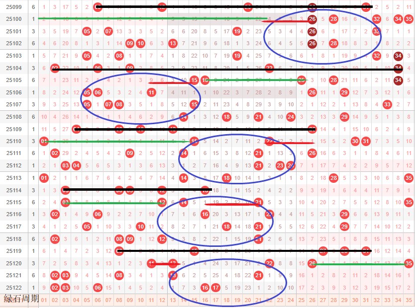 如图所示:体现的是3个局部走势的发展周期,圆圈为密集处的填空,本期定性为新局部走势第5期,架构填空第2期,主力填空第3期,定性本周期蛋跨13-23,真实空间为26-35,则本期开212 221区间比,3尾界定蛋跨。如本期是22-32则直接守住3区就好了,会用672尾界定蛋跨。则会考113 104 014区间比。本期首尾只能在拉伸或者右推中选。