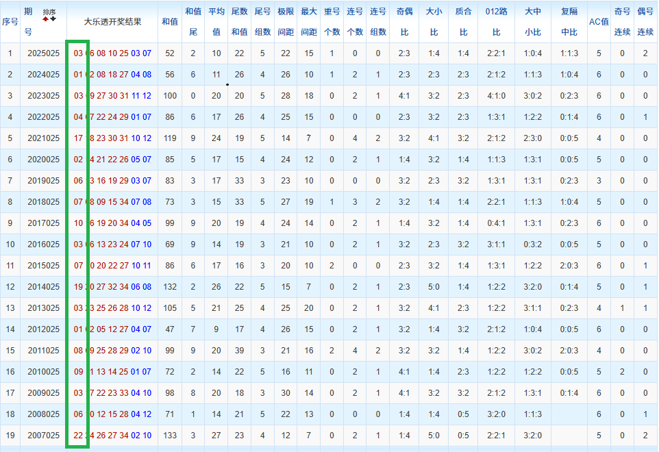 通过观察,我发现往年同期的开奖数据与本期号码之间存在显著关联。具体来说,在前区号码中,从第一位至第五位,通常会有约三个位置上的数字与往年同期相同位置的号码一致;而后区号码中,也有多期开奖结果直接包含了往年同期的数字。因此,我们可以借助往年同期各位置上的号码,作为分析本期开奖情况的重要依据。在此基础上,还可结合往年同期的其他相关条件,进行综合性的号码组合推荐。