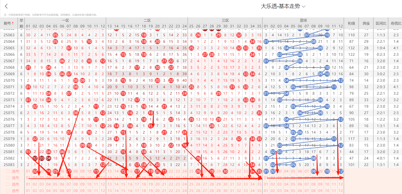 1、前区特征分析:(通过整体走势不难看出每期开奖号都具备以下明显的特征点)