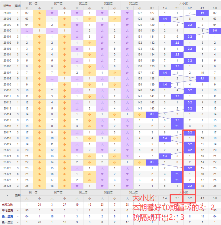 上期大小比:3:2,近10期大小比出现情况:3:2、1:4、3:2、3:2、1:4、0:5、3:2、2:3、2:3、3:2,最近10期出现5期3:2,出现2期2:3,出现0期4:1,出现2期1:4,出现0期5:0,出现1期0:5,根据近10期规律本期看好10期循环的3:2,防隔期开出2:3,综上所述推荐大小比推荐:2:3,重点关注:3:2。
