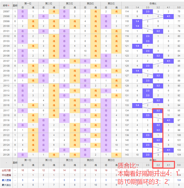 上期奇偶比:2:3,近10期奇偶比出现情况:3:2、2:3、4:1、3:2、3:2、2:3、3:2、2:3、4:1、2:3,最近10期出现4期3:2,出现4期2:3,出现2期4:1,出现0期1:4,出现0期5:0,出现0期0:5,根据近10期规律本期看好隔期开出4:1,防10期循环开出3:2,综上所述推荐奇偶比推荐:3:2,重点关注:4:1。