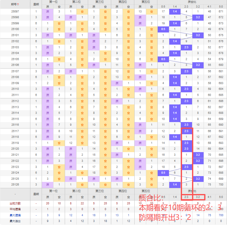 上期质合比:1:4,近10期质合比出现情况:2:3、1:4、2:3、2:3、3:2、2:3、2:3、0:5、3:2、1:4,最近10期出现3期3:2,出现4期2:3,出现0期4:1,出现2期1:4,出现0期5:0,出现1期0:5,根据近10期规律本期看好10期循环的2:3,防隔期开出3:2,综上所述推荐质合比推荐:3:2,重点关注:2:3。