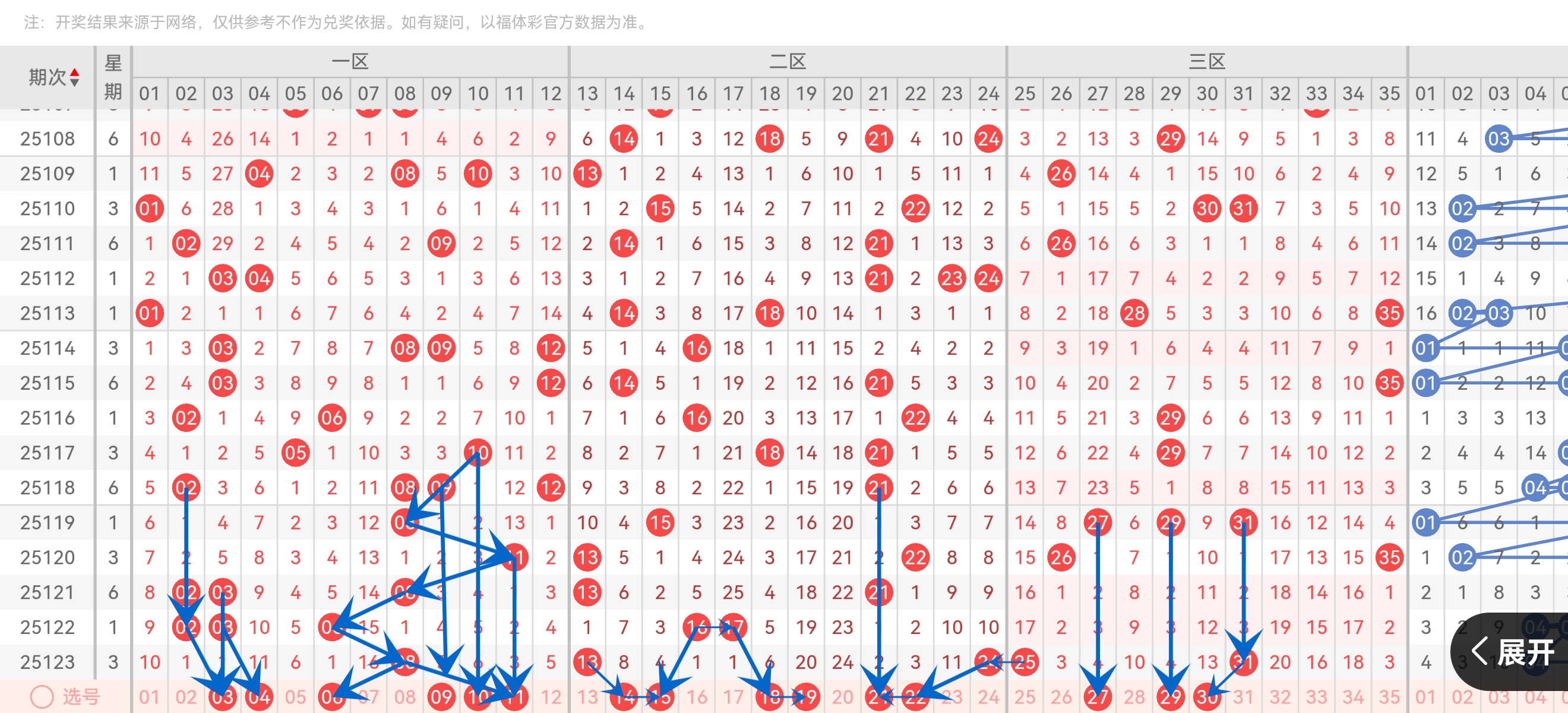 1路(04,07,13...) :上期13、25、31占3枚,过热需防转冷→ 缩量至1-2枚,关注10、19