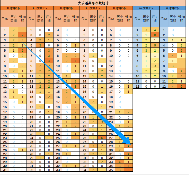 1、如上图,背景越深色,说明出号频率越高。