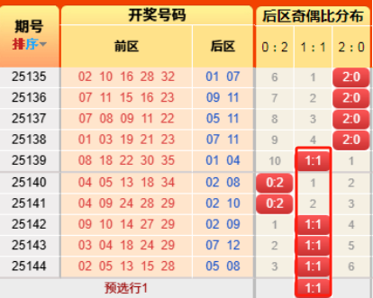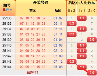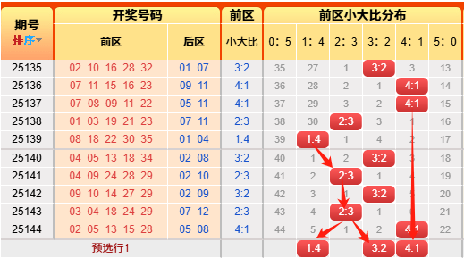 上期前区小大比4:1,命中,近期统计61期中54期。言归正传我们继续用历史数据说话,前区小大比分成6051423324150(如图),我统计了一下历史出现次数,05出现106次、14出现514次、23出现975次、32出现810次、41出现354次,50出现53次,再看近10期小大比出现次数比为013330,通过历史数据对比观察以及根据遗漏对称理论原则,故本期我们选择1:4、3:2、4:1(具体精准方向请查看小车小大比精选)