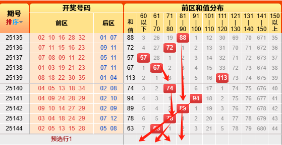 上期开出和值63,命中区间,本次我们先根据历史次数统计,和值60以下开出249次、61-70开出236次、71-80开出370次,81-90开出487次、91-100开出497次,101-110开出380次、111-120开出313次、121-130开出155次、131-140开出90次、141-150开出26次、150以上开出9次,再来看近十次以上和值分别开出了1次、2次、3次、2次、1次、0次、1次、0次、0次、0次、0 ,低于阈值的有60区间以下、61-70区间、81-90区间、91-100区间、101-110区间、121-130区间,再根据遗漏斜率对称理论,本期注意60区间以下、61-70区间、81-90区间、71-80区间。