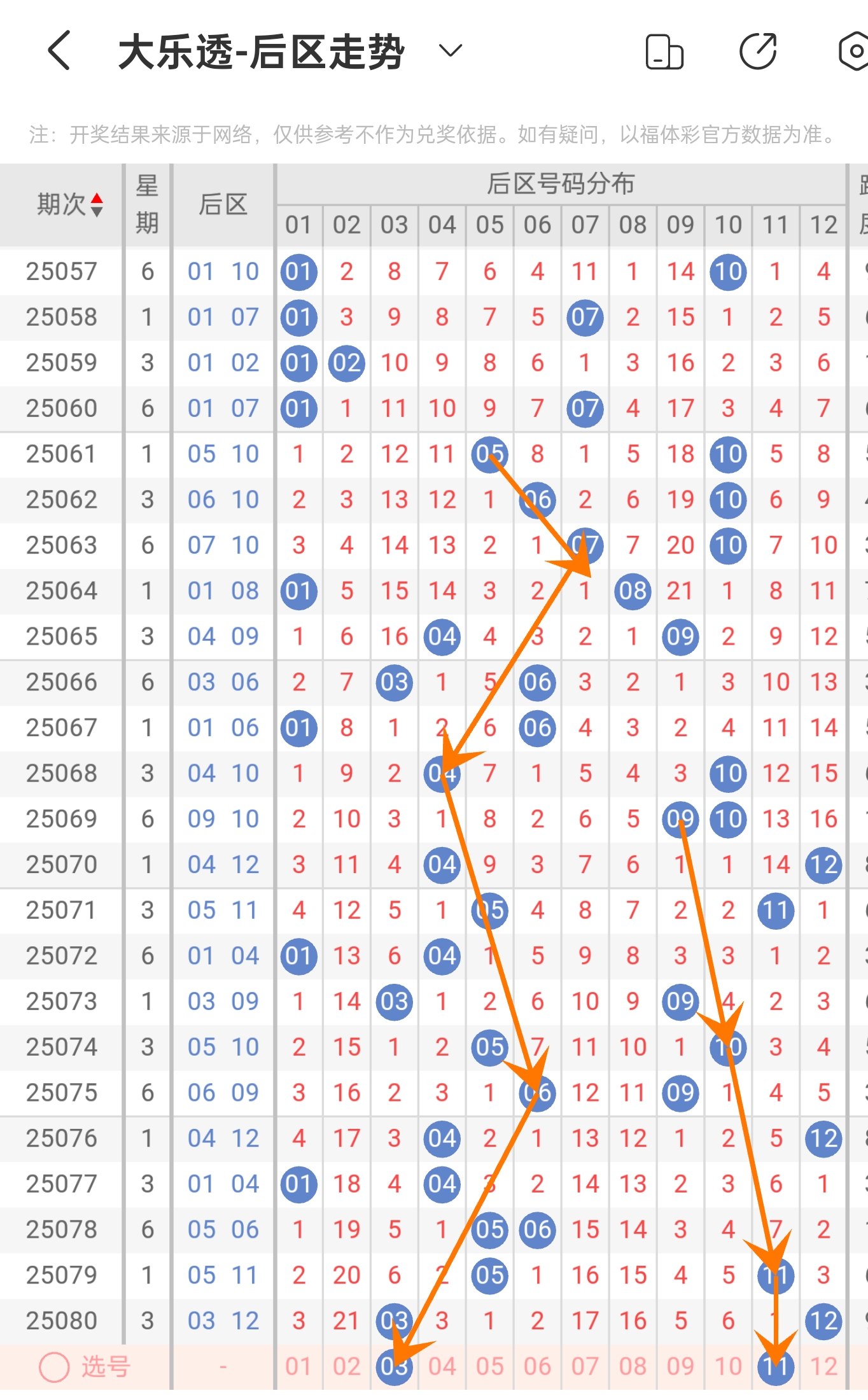 03 (4次!): 077、080、083、085期出现,是后区最耀眼明星。