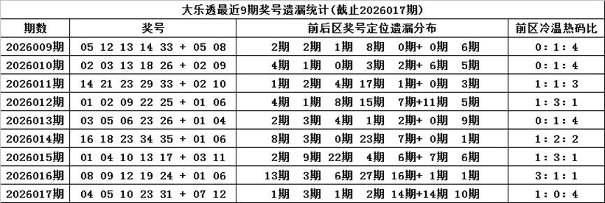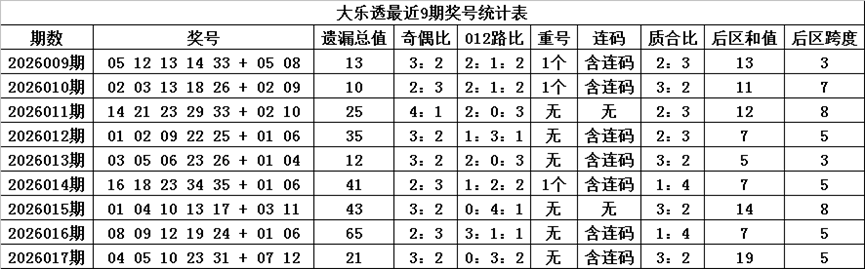 体彩大乐透第2026017期奖号为:04 05 10 23 31 + 07 12,各位号码遗漏期数分别为:1期、3期、1期、2期、14期+14期、10期,前区号码遗漏总期数为21期,012路比为0:3:2,奇偶比为3:2,没有开出重复号码。后区号码遗漏总期数为24期,和值为19,跨度为5。