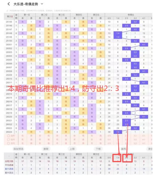 4、奇偶比:上期开出1个奇数,出4个偶数,奇偶比为1:4,整体看奇数强势,本期关注偶数出号,本期推荐出2:3,防守出1:4。