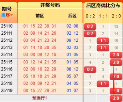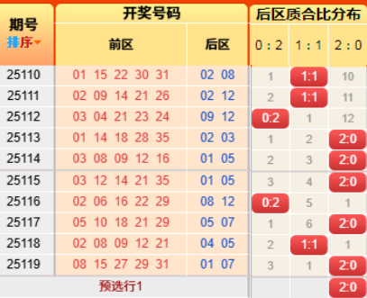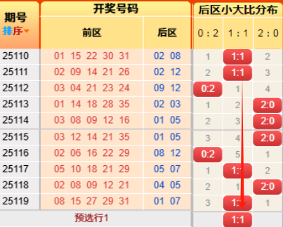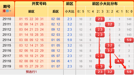 上期前区小大比2:3,命中啦!近期统计48期中43期。言归正传我们继续用历史数据说话,前区小大比分成6种0:5、1:4、2:3、3:2、4:1、5:0(如图),我统计了一下历史出现次数,0:5出现106次、1:4出现513次、2:3出现964次、3:2出现803次、4:1出现349次,5:0出现52次,再看近10期小大比出现次数比为0:0:5:3:1:1,通过历史数据对比观察以及根据遗漏对称理论原则,故本期我们选择5:0、2:3、3:2;(具体精准方向请查看小车小大比精选)