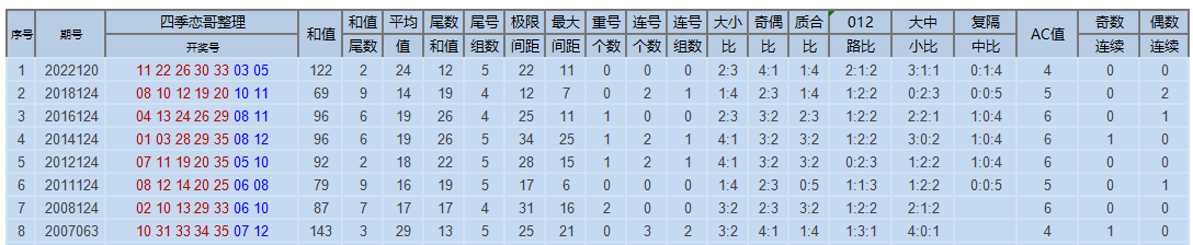 下图为大乐透彩种诞生以来每年的120期各类数据以及历年同日期开奖数据,各位大佬及彩友们请拿走~