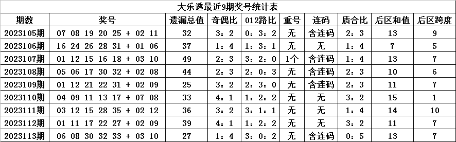 体彩大乐透第2023113期奖号为:06 08 30 32 33 + 03 10,各位号码遗漏期数分别为:4期、7期、4期、4期、8期+5期、5期,前区号码遗漏总期数为27期,012路比为3:0:2,奇偶比为1:4,没有开出重复号码。后区号码遗漏总期数为10期,和值为13,跨度为7。