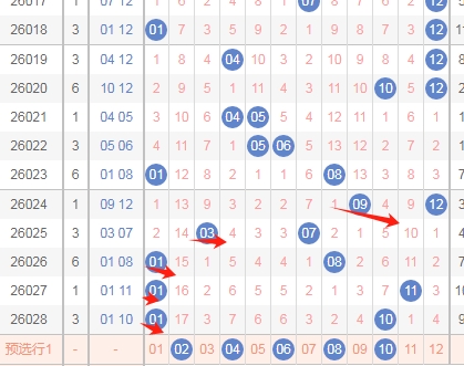 上图是体彩大乐透后区开奖号码走势分布图,我标志出来的数字我觉得可以看右边这个数字的范围07 08 09 10 11 12,标志出来的红色箭头表示右边这个数字最近开出的遗漏周期,上期开出数字10遗漏周期是7期,上上期开出数字11遗漏周期是11期,那么根据这个遗漏周期来分析的话,本期右边这个区域出遗漏周期小的数字机会是有的,关注数字07 08 09 10 11 12。