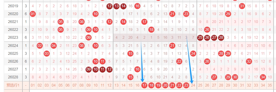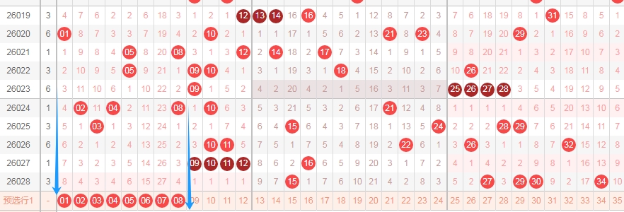 那么根据上面的分析,本期体彩大乐透可以得到这些数据: