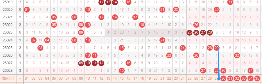 上图是体彩大乐透前区开奖号码走势分布图,我在上面走势图中标志出来的数字30 31 32 33 34 35一共有6个数字,这个区域的数字上期开出了两个数字,最近十几期前面几期出号码不多,所以个人感觉这个区域的数字本期还会出现号码,可以关注这个区域的数字出1个或者2个。