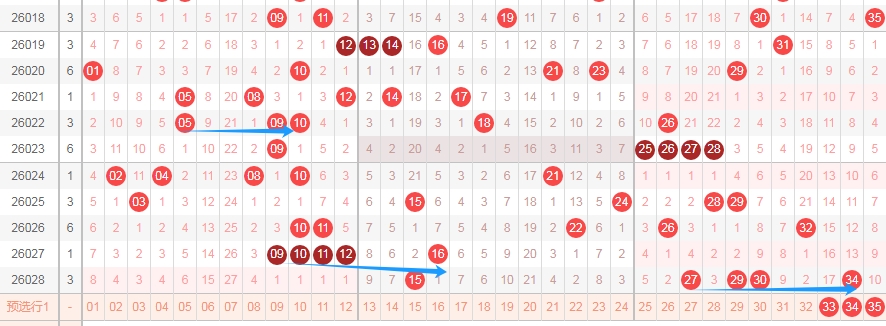 上图是体彩大乐透前区开奖号码走势分布图,我在上面走势图中标志出来的蓝色横向箭头总共有3条,你们仔细看看这三条横向箭头,是不是觉得有点相似的地方呢?那么本期是不是可以考虑3字头的数字出连号呢?我在上面走势图中标志出来的数字33 34 35会不会一次性开出来呢?