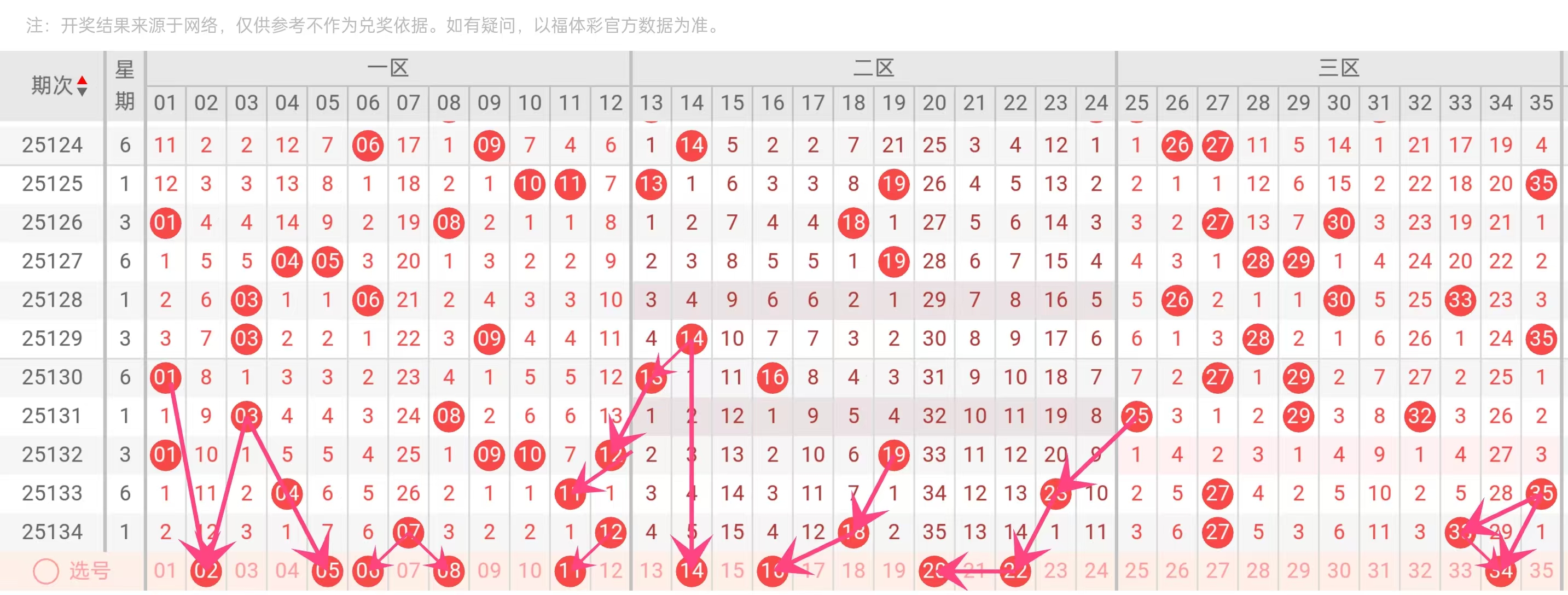 区间分布优化:前区1-35可分为五个区间(1-7、8-14、15-21、22-28、29-35)。近5期区间出号不均,1-7区间出现5次,但主要集中在01、03、04、07,因此选02、05、06弥补冷号;8-14区间出现7次,但12已杀,选08、11、14覆盖温冷号;15-21区间出现4次,选16、20平衡大小;22-28区间出现6次,但27已杀,选22作为冷号;29-35区间出现5次,但29、35已杀,选34作为冷号。这样确保各区间有号码覆盖,避免断层。