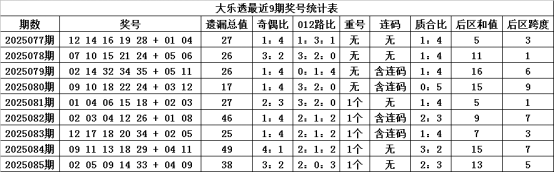 体彩大乐透第2025085期奖号为:02 05 09 14 33 + 04 09,各位号码遗漏期数分别为:2期、20期、0期、5期、11期+0期、9期,前区号码遗漏总期数为38期,012路比为2:0:3,奇偶比为3:2,包含1个重复号码:09。后区号码遗漏总期数为9期,和值为13,跨度为