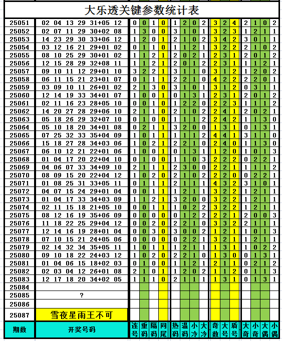以下是作者手工统计的大乐透关键参数统计表,对喜欢参数分析、过滤缩水、选号胆杀的技术性大乐透爱好者有所帮助,其它读者可略过不看。