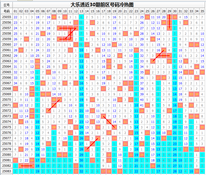 大乐透近30期前区号码冷热图(数字为遗漏期数,蓝色标记的为遗漏超过10期的大冷号)