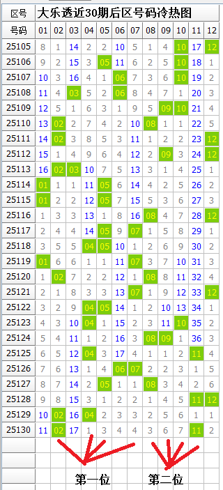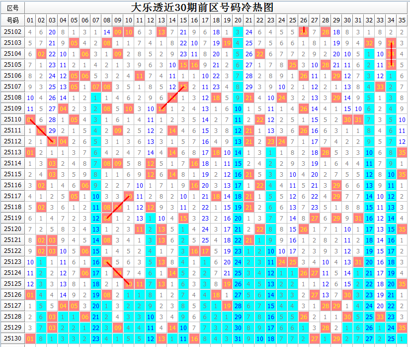 大乐透近30期前区号码冷热图(数字为遗漏期数,蓝色标记的为遗漏超过10期的大冷号)