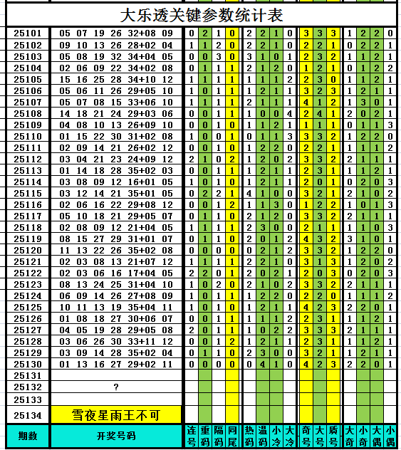 以下是作者手工统计的大乐透关键参数统计表,对喜欢参数分析、过滤缩水、选号胆杀的技术性大乐透爱好者有所帮助,其它读者可略过不看。