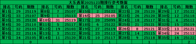 超级大乐透前区是从01-35的号码中每期开出5个号码,把历史数据按照出现次数排行后分成五个区,每个区7个号码,前二位的号码是热位号,中三位的号码是温位号,后二位的号码是冷位号,理论上每个区每期是开1个号码,对比最近开出的数据分析: