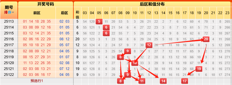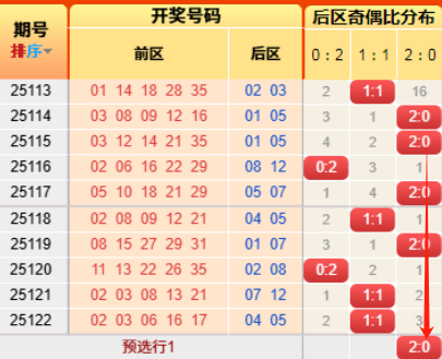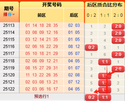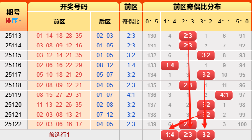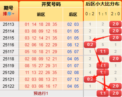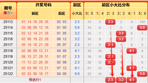 上期前区小大比5:0,近期统计51期中45期。言归正传我们继续用历史数据说话,前区小大比分成6051423324150(如图),我统计了一下历史出现次数,05出现106次、14出现513次、23出现965次、32出现803次、41出现350次,50出现53次,再看近10期小大比出现次数比为004222,通过历史数据对比观察以及根据遗漏对称理论原则,故本期我们选择2:3、3:2、4:1(具体精准方向请查看小车小大比精选)