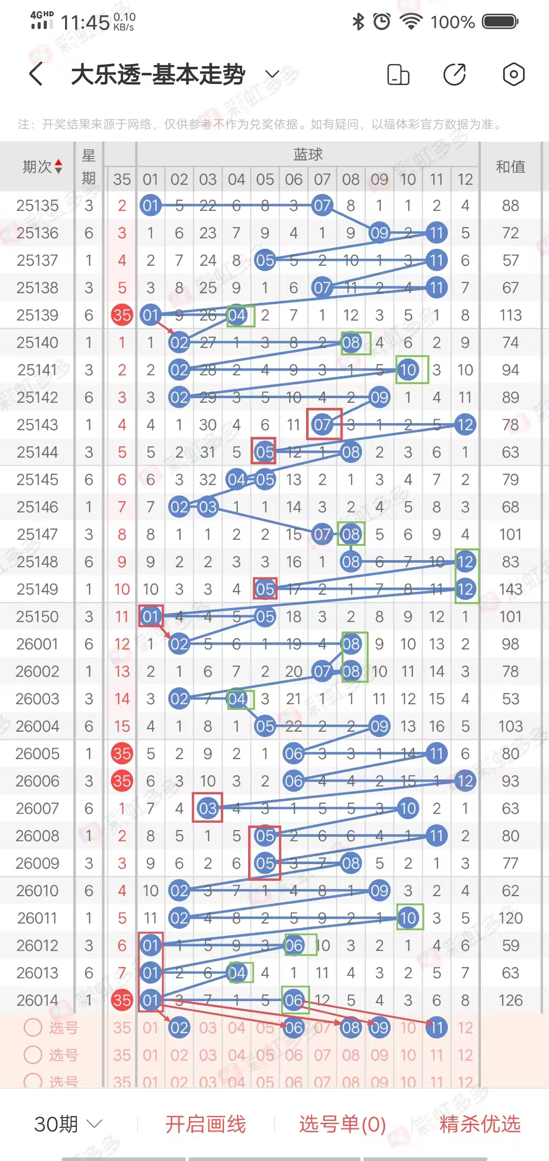 大乐透和值:前区5个开奖号码的和,