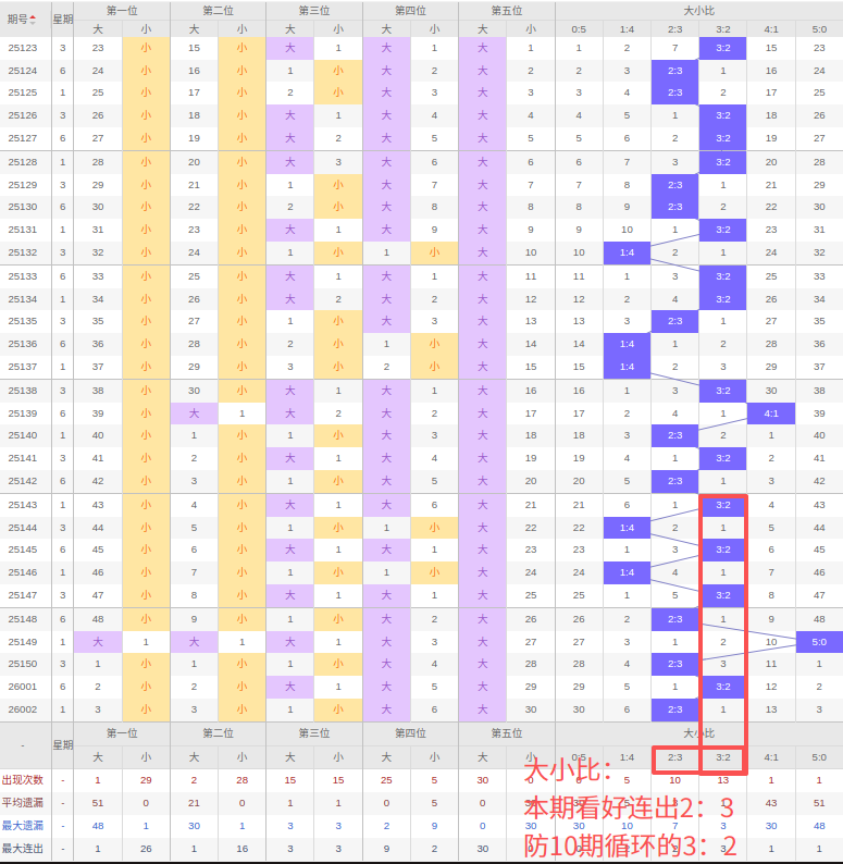 上期大小比:2:3,近10期大小比出现情况:3:2、1:4、3:2、1:4、3:2、2:3、5:0、2:3、3:2、2:3,最近10期出现4期3:2,出现3期2:3,出现0期4:1,出现2期1:4,出现1期5:0,出现0期0:5,根据近10期规律本期看好连出2:3,防10期循环的3:2,综上所述推荐大小比推荐:3:2,重点关注:2:3。