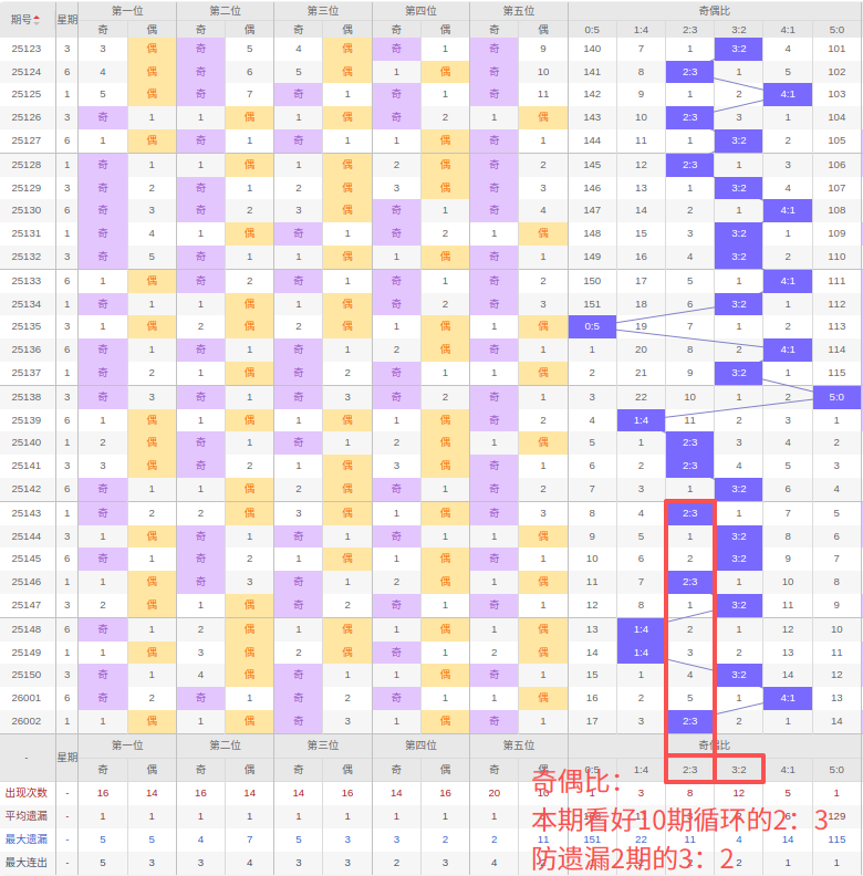 上期奇偶比:2:3,近10期奇偶比出现情况:2:3、3:2、3:2、2:3、3:2、1:4、1:4、3:2、4:1、2:3,最近10期出现4期3:2,出现3期2:3,出现1期4:1,出现2期1:4,出现0期5:0,出现0期0:5,根据近10期规律本期看好10期循环的2:3,防遗漏2期的3:2,综上所述推荐奇偶比推荐:3:2,重点关注:2:3。