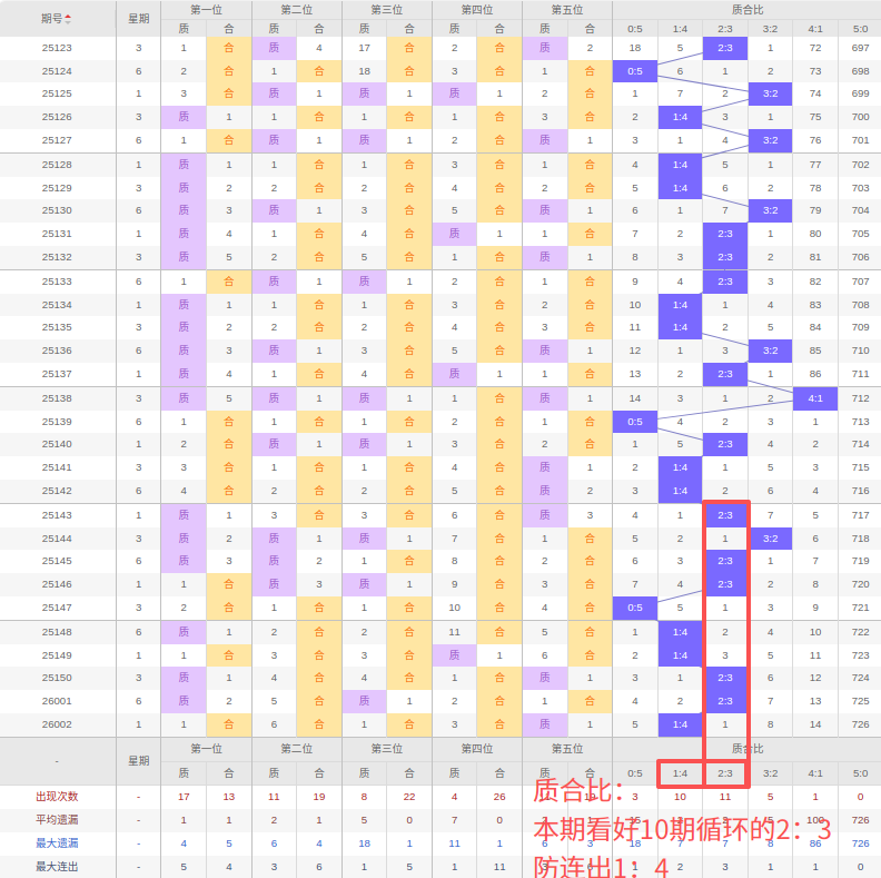 上期质合比:1:4,近10期质合比出现情况:2:3、3:2、2:3、2:3、0:5、1:4、1:4、2:3、2:3、1:4,最近10期出现1期3:2,出现5期2:3,出现0期4:1,出现3期1:4,出现0期5:0,出现1期0:5,根据近10期规律本期看好10期循环的2:3,防连出1:4,综上所述推荐质合比推荐:1:4,重点关注:2:3。