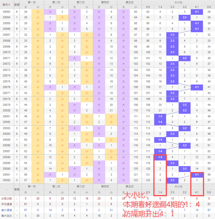 上期大小比:2:3,近10期大小比出现情况:3:2、2:3、1:4、3:2、1:4、1:4、2:3、3:2、4:1、2:3,最近10期出现3期3:2,出现3期2:3,出现1期4:1,出现3期1:4,出现0期5:0,出现0期0:5,根据近10期规律本期看好遗漏4期的1:4,防隔期开出4:1,综上所述推荐大小比推荐:4:1,重点关注:1:4。